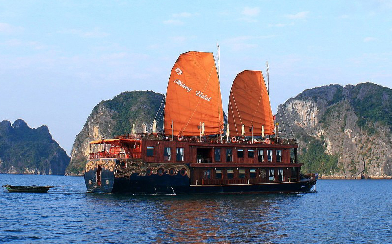 Embark on your beautiful five-star, traditional wooden junk, the Halong Violet. After a delicious