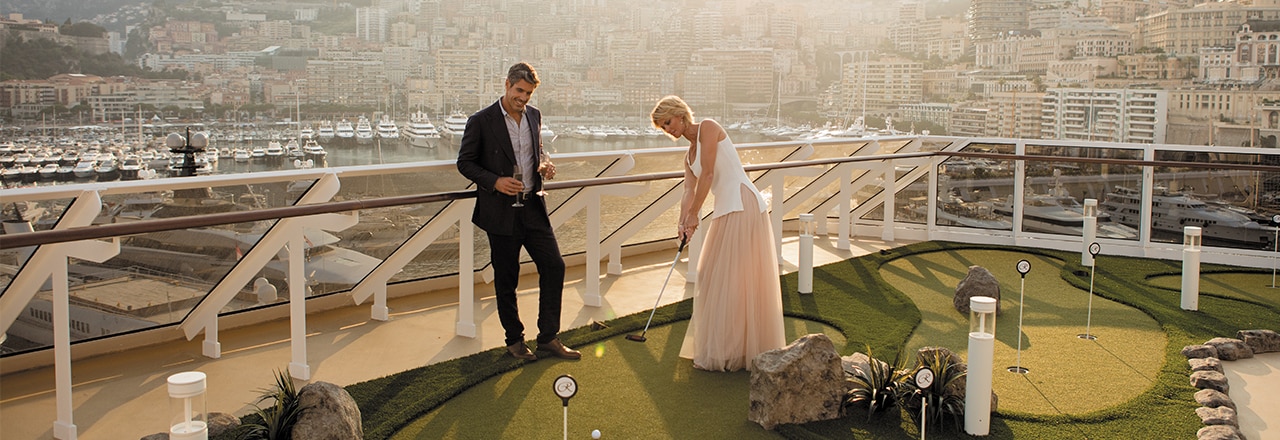 POOL DECK: Our open-air upper decks are always hubs of activity. Relax in the shade or work on your tan on a comfortable chaise lounge, refreshing drink in hand; or jog around the oval track in the fresh sea air. Ease into a soothing whirlpool or swim a few leisurely laps in our heated resort-style pool. Golf aficionados can practice their swing in our golf driving net or take a turn on the ocean-view putting greens. You can play a friendly game of table tennis or shuffleboard, or delight in a delicious treat from our Pool Grill with perfect al fresco views.