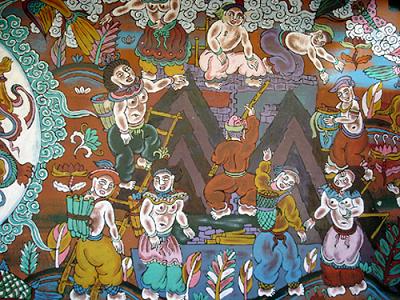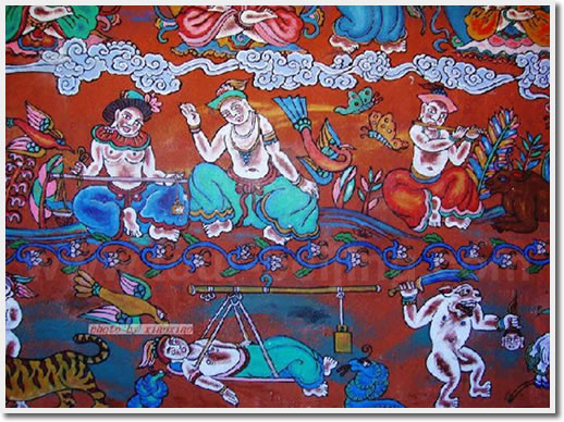 Murals. The village of Baisha (White Sand) lies on the vast plain that unfolds at the base of the Yuelongxue Shan (Jade Dragon Snow Mountain). Visitors may find the village a bit of a quandary. As past capital of the Naxi Kingdom before the Mongol invasions of the 13th century and site of the fascinating Baisha Murals, it now appears to be nothing more than a sleepy village of mud-packed and stone farm houses, dusty lanes and an annoying array of hawker stalls eager to pounce upon the bus loads of Chinese tourists now flocking to the Lijiang region. But suspend judgment and look beyond and around the obvious – Baisha is an important link to the historic integrity of the Naxi people and the Murals are – market withstanding – a worthwhile visit.