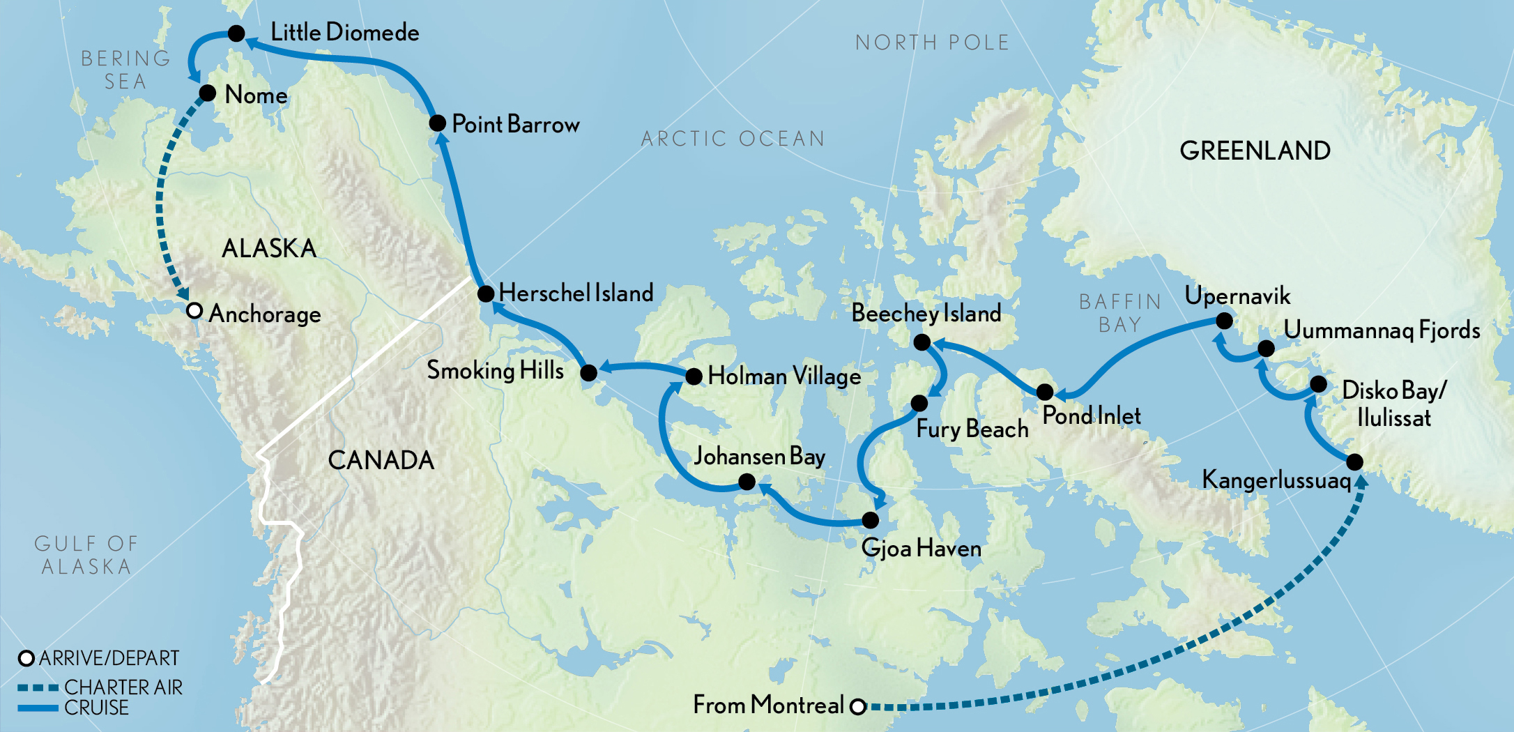 - Cruise the full extent of the Northwest Passage for 21 nights, voyaging from Greenland to the Canadian Arctic to the Bering Sea and ending in Alaska.
