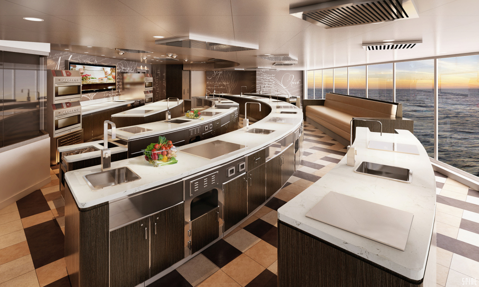 luxurious cruise ship: the Culinary Arts Kitchen. Elevating cuisine to an art form, the Culinary Arts Kitchen will provide guests with all the ingredients needed to expand their culinary skills in a welcoming environment reminiscent of the most prestigious cooking schools in France in both layout and design. Eighteen individual cooking stations sit atop three long curved rows with white quartzite countertops and stainless steel accents, belaying the complex and richly flavored foods guests will prepare during the classes. Guests attending classes in the Culinary Arts Kitchen will receive highly-individualized instruction, as each student will cook from his/her own personal workstation for authentic, hands-on training. The culinary workstations are fully equipped with top-of-the-line induction cooktops, stainless steel sinks and a comprehensive collection of additional cooking essentials.