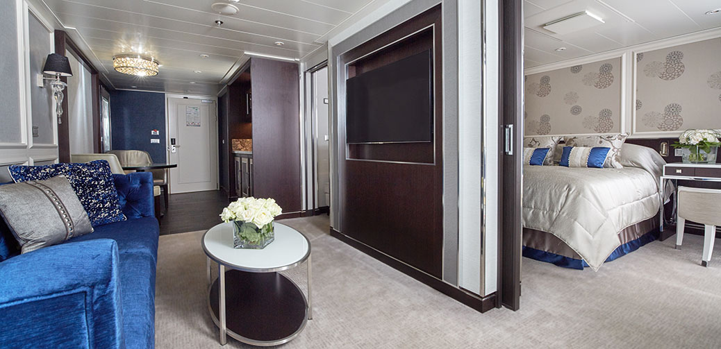 The new 626-square-foot Penthouse Suite has received raves. Its sapphire jewel-inspired décor with separate dining and spacious living space is a huge hit. This suite also includes a beautifully elegant marble bath with dual vanity sinks, and the largest veranda at sea totaling 176 square feet.